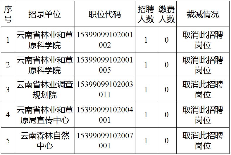 根據(jù)《云南省林業(yè)和草原局2020年事業(yè)單位公開招聘工作人員公告》,對(duì)實(shí)際繳費(fèi)人數(shù)與計(jì)劃招聘人數(shù)比例未達(dá)到3:1的招聘崗位予以取消或相應(yīng)遞減招聘人數(shù),截至2020年9月29日繳費(fèi)結(jié)束,結(jié)合各崗位實(shí)際報(bào)名繳費(fèi)情況,現(xiàn)將崗位裁減情況公告如下: