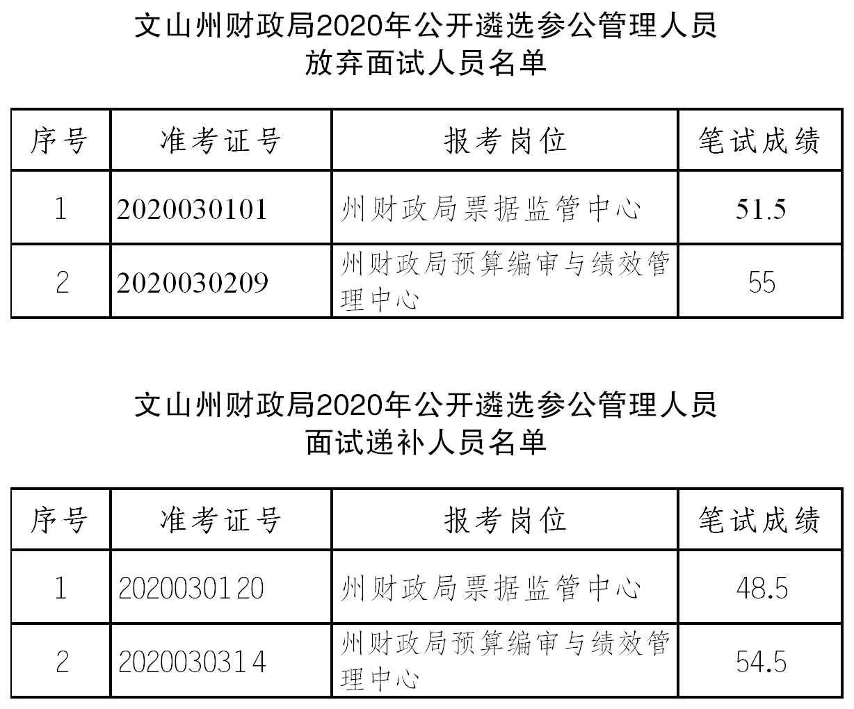 文山州財(cái)政局2020年公開(kāi)遴選參公管理人員于2020年11月26日前進(jìn)行面試資格確認(rèn),現(xiàn)有2名考生自愿放棄面試資格,根據(jù)《文山州財(cái)政局2020年公開(kāi)遴選參公管理人員公告》《文山州財(cái)政局2020年公開(kāi)遴選參公管理人員面試公告》及公開(kāi)遴選有關(guān)規(guī)定,自動(dòng)放棄面試資格,將順延遞補(bǔ)下一名考生。現(xiàn)將放棄面試人員及遞補(bǔ)人員名單公告如下: