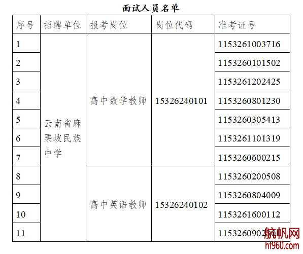 報考云南省麻栗坡民族中學(xué)高中數(shù)學(xué)教師(崗位代碼為15326240101)、高中英語教師(崗位代碼為15326240102)2個崗位,且經(jīng)過資格復(fù)審合格的人員,面試人員名單見附件。