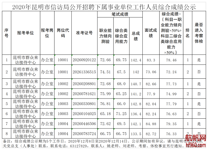 2020年昆明市信訪局公開招聘下屬事業(yè)單位工作人員綜合成績公示