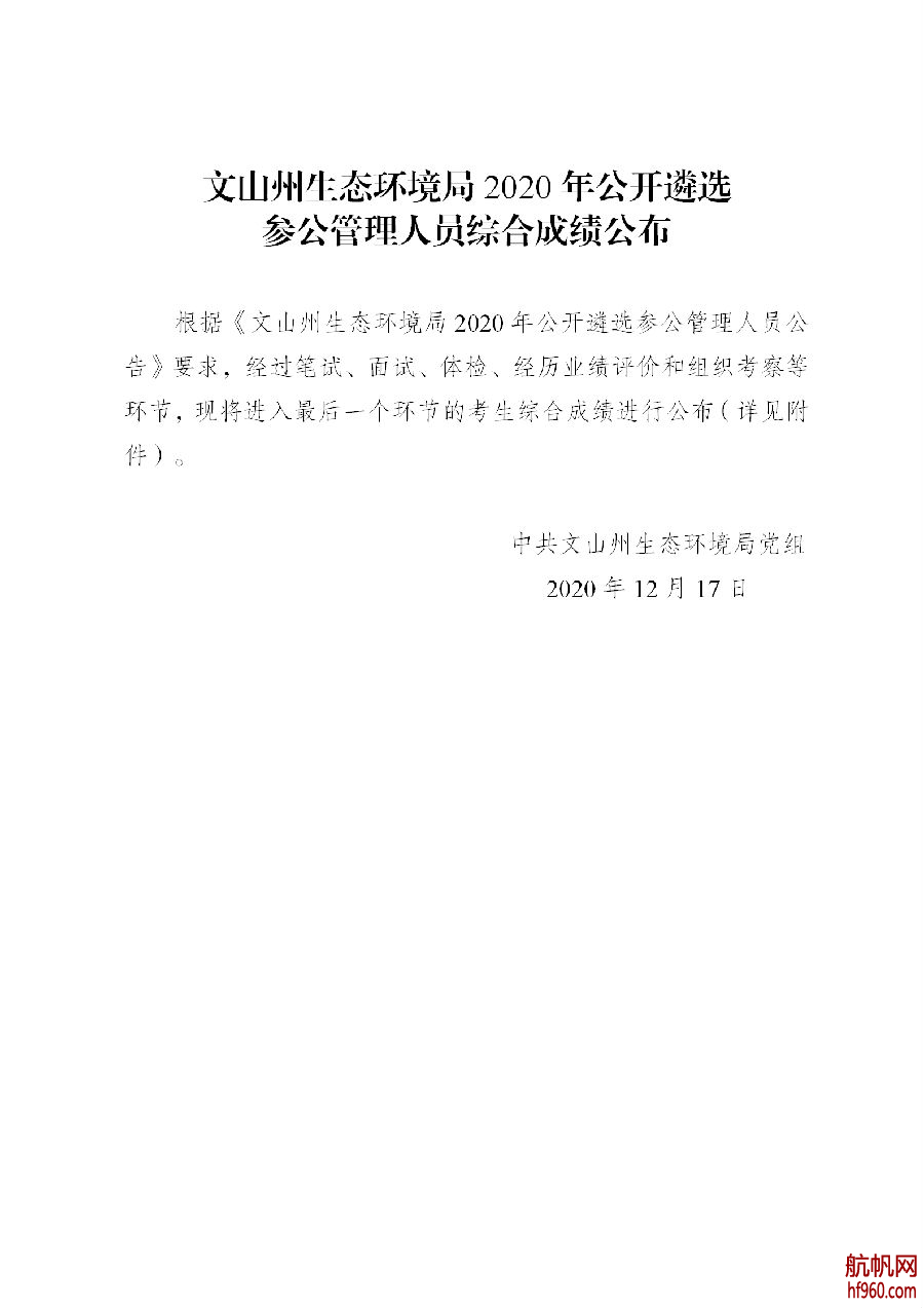 文山州生態(tài)環(huán)境局2020年公開(kāi)遴選參公管理人員綜合成績(jī)公布