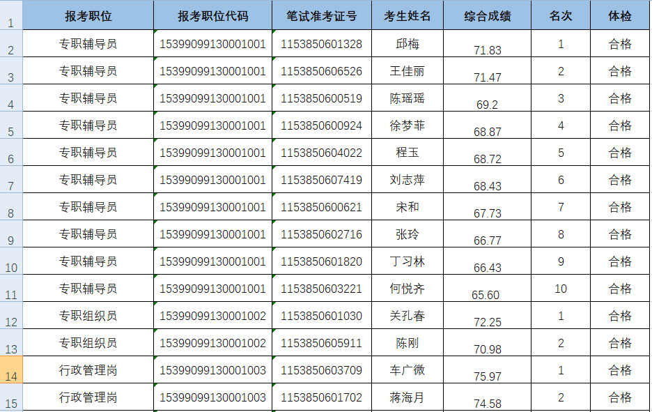 我校嚴(yán)格按照《事業(yè)單位公開招聘人員暫行規(guī)定》(中華人民共和國人事部令第6號)《云南省事業(yè)單位公開招聘工作人員辦法》(云人社發(fā)〔2016〕182號)及《云南省事業(yè)單位公開招聘工作人員面試測評暫行辦法》(云人社發(fā)〔2016〕405號)有關(guān)文件規(guī)定及《云南輕紡職業(yè)學(xué)院2020年第三批公開招聘事業(yè)單位工作人員公告》細(xì)則,于2020年10月24日全省統(tǒng)一筆試和12月5日學(xué)校面試兩個(gè)階段開展招聘工作,根據(jù)綜合成績排名經(jīng)體檢及考核考察階段,學(xué)校于2021年1月11日組織召開了云南輕紡職業(yè)學(xué)院第1次院長辦公會,確定擬聘用人員28人,現(xiàn)將擬聘用人員信息進(jìn)行公示。
