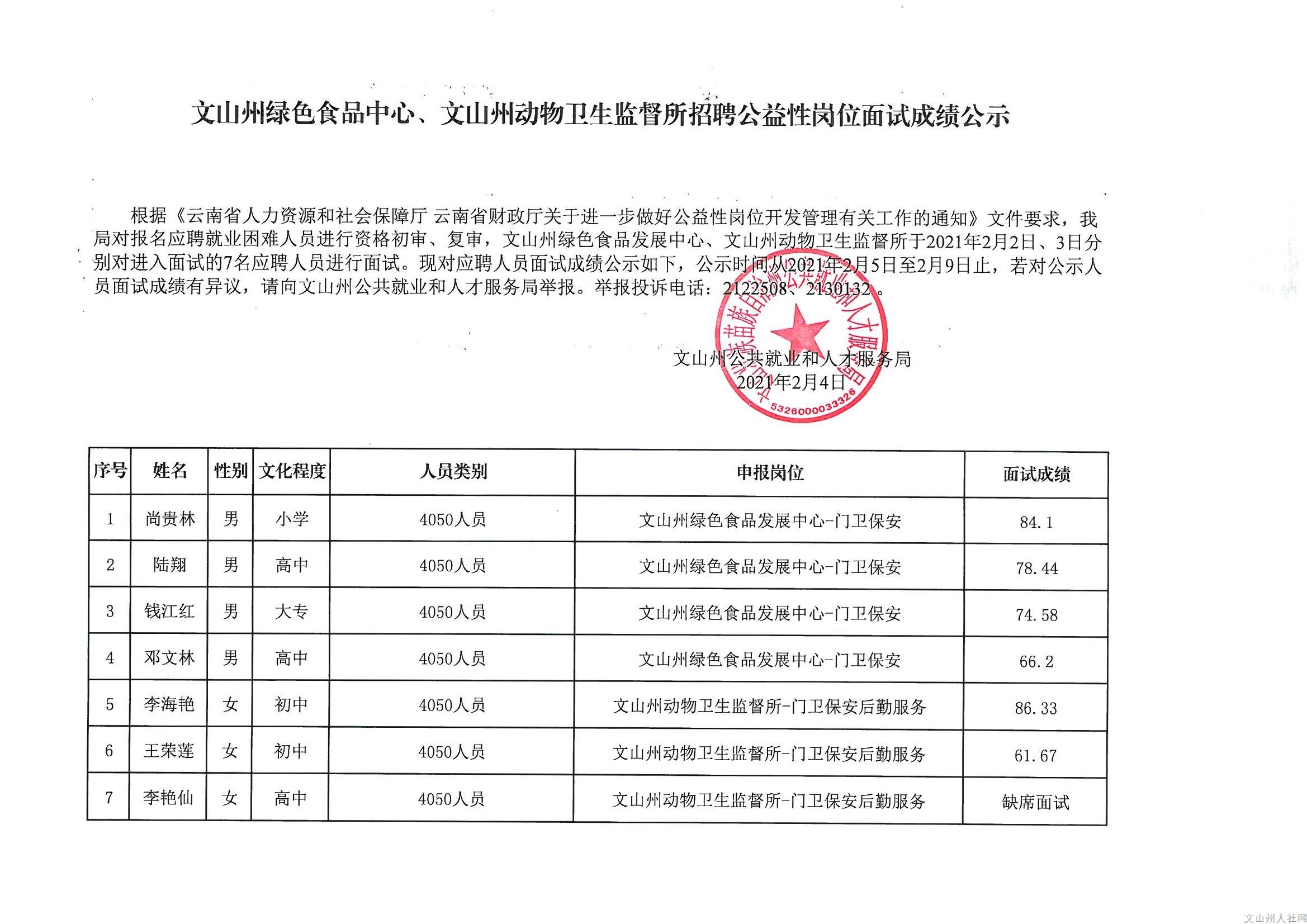 文山州綠色食品中心、文山州動物衛(wèi)生監(jiān)督所招聘公益性崗位面試成績公示