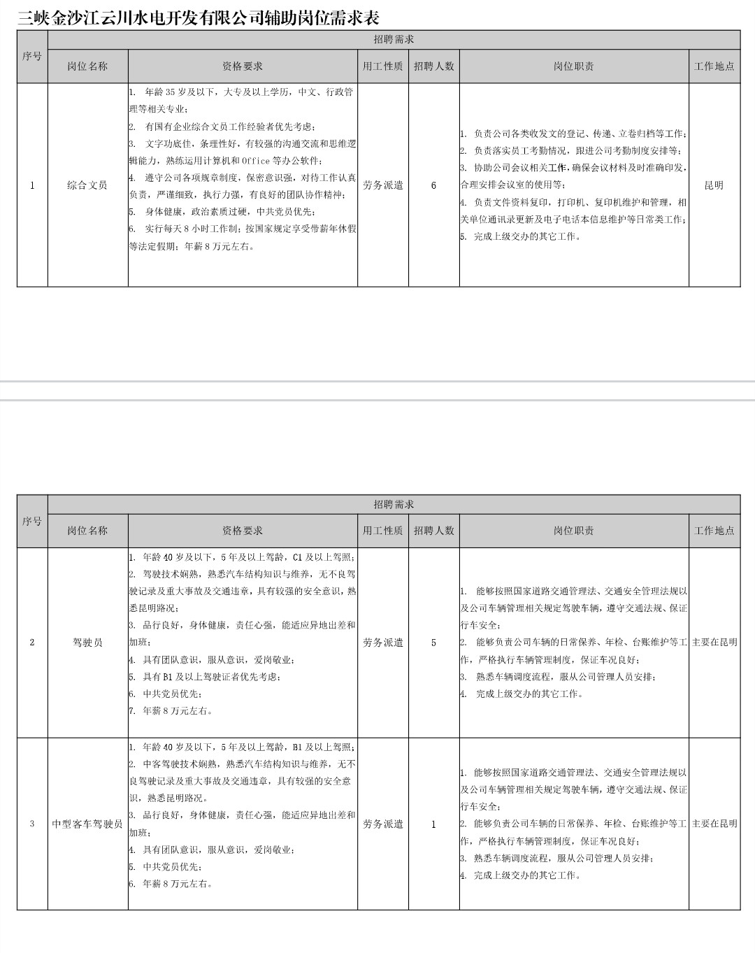 一、招聘崗位及要求(詳見三峽金沙江云川水電開發(fā)有限公司輔助崗位需求表)