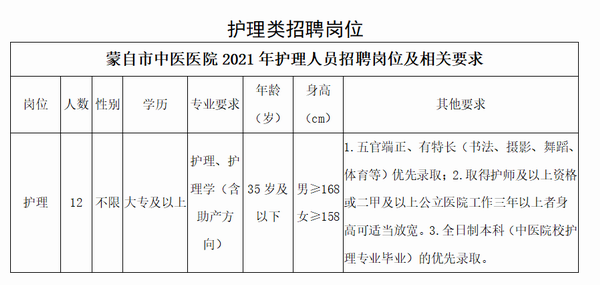 詳見《蒙自市中醫(yī)醫(yī)院2021年護理人員招聘崗位及相關(guān)要求表》。
