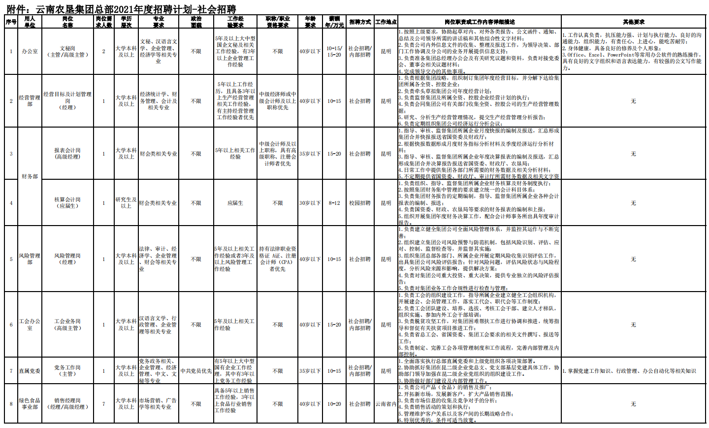 集團(tuán)總部各部門共計劃面向社會公開招聘8個崗位、15人,招聘的具體崗位、資格條件等詳見附件:《云南農(nóng)墾集團(tuán)總部2021年度招聘計劃-社會招聘》。