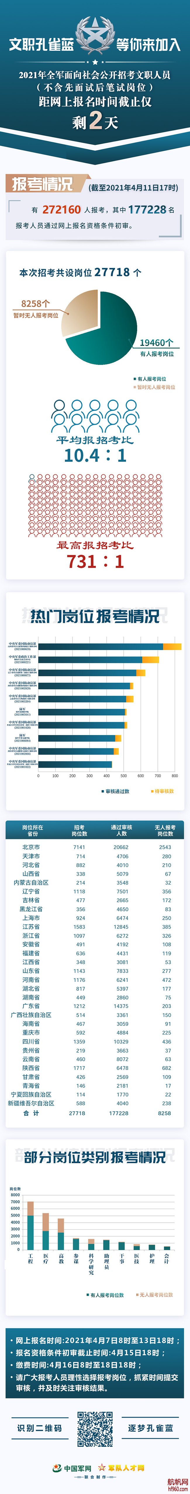 2021年全軍面向社會(huì)公開招考文職人員(不含先面試后筆試崗位)網(wǎng)上報(bào)名于4月7日8時(shí)正式開通。截至4月11日17時(shí),有272160人報(bào)考,其中177228名報(bào)考人員通過網(wǎng)上報(bào)名資格條件初審,平均報(bào)招考比為10.4∶1,最高報(bào)招考比為731∶1。有人報(bào)考的崗位19460個(gè),暫時(shí)無人報(bào)考的崗位8258個(gè)。請(qǐng)廣大報(bào)考人員理性選擇報(bào)考崗位,抓緊時(shí)間提交審核,并及時(shí)關(guān)注審核結(jié)果。相關(guān)崗位報(bào)考情況如下: