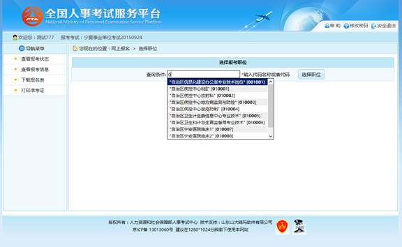 通過點擊“選擇職位”選項,可以跳轉到選擇報考職位界面,如下圖所示: