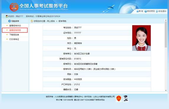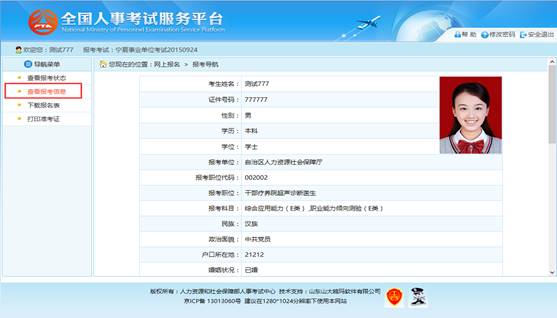 通過點擊系統(tǒng)導航菜單的“查看報考信息”選項,可進入查看考生報考信息的