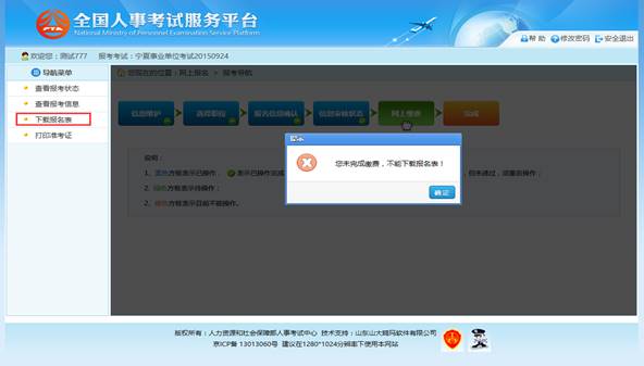名表”選項,系統(tǒng)會提示“您未完成繳費不能下載報名表”,如下圖所示:
