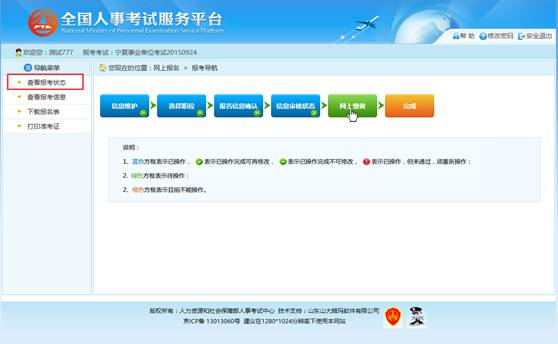通過點擊系統(tǒng)導航菜單的“查看報考狀態(tài)”選項,可進入查看狀態(tài)頁面,如下圖