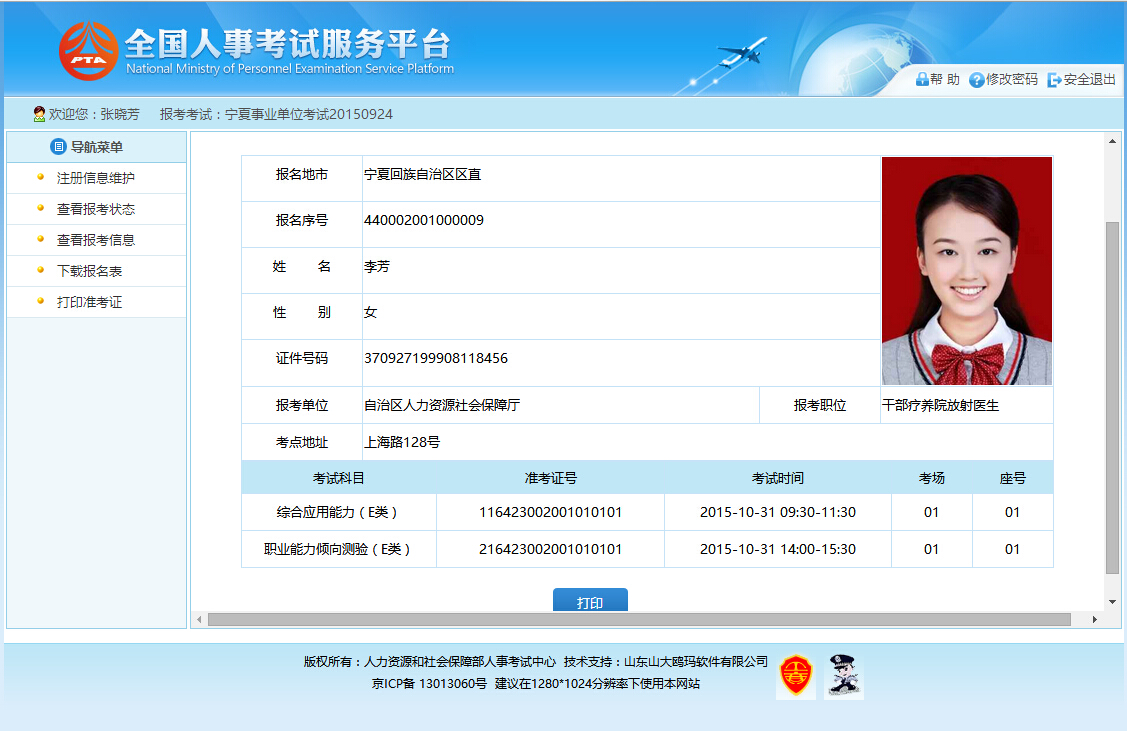 通過點擊系統(tǒng)導航菜單的“打印準考證”選項,可進入準考證打印頁面,如下