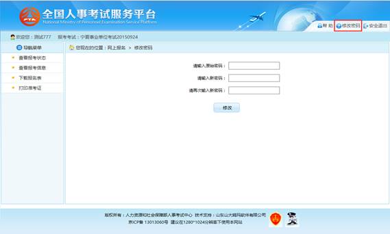 通過點擊系統(tǒng)右上角的“修改密碼”選項,可跳轉到修改密碼頁面,如下圖所示: