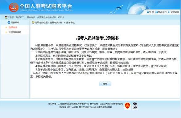 通過點擊“接受”按鈕,進入查看考生承諾書的頁面,如下圖所示:
