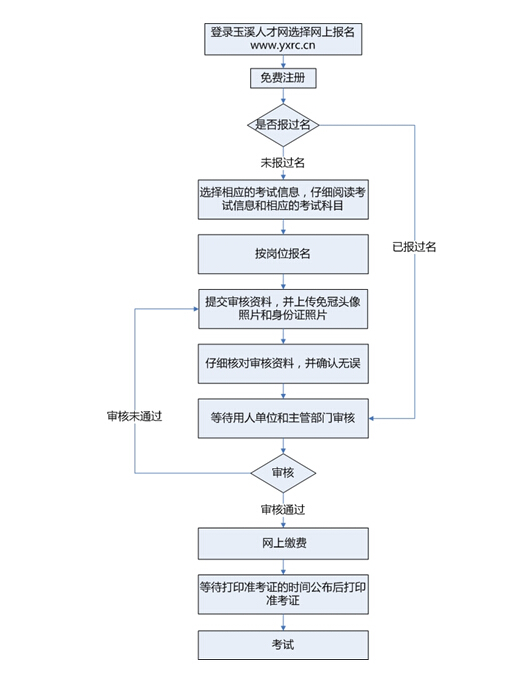 網(wǎng)絡(luò)報(bào)名的大致流程為:登錄玉溪人才網(wǎng)→網(wǎng)上報(bào)名入口→注冊(cè)→查看招聘崗位→按崗位報(bào)名并填寫報(bào)名資料→等待審核→審核通過→網(wǎng)上交費(fèi)(注意查看交費(fèi)狀態(tài),確認(rèn)交費(fèi)成功)→打印筆試準(zhǔn)考證(打印時(shí)間在筆試公告內(nèi)另行通知)→參加筆試。