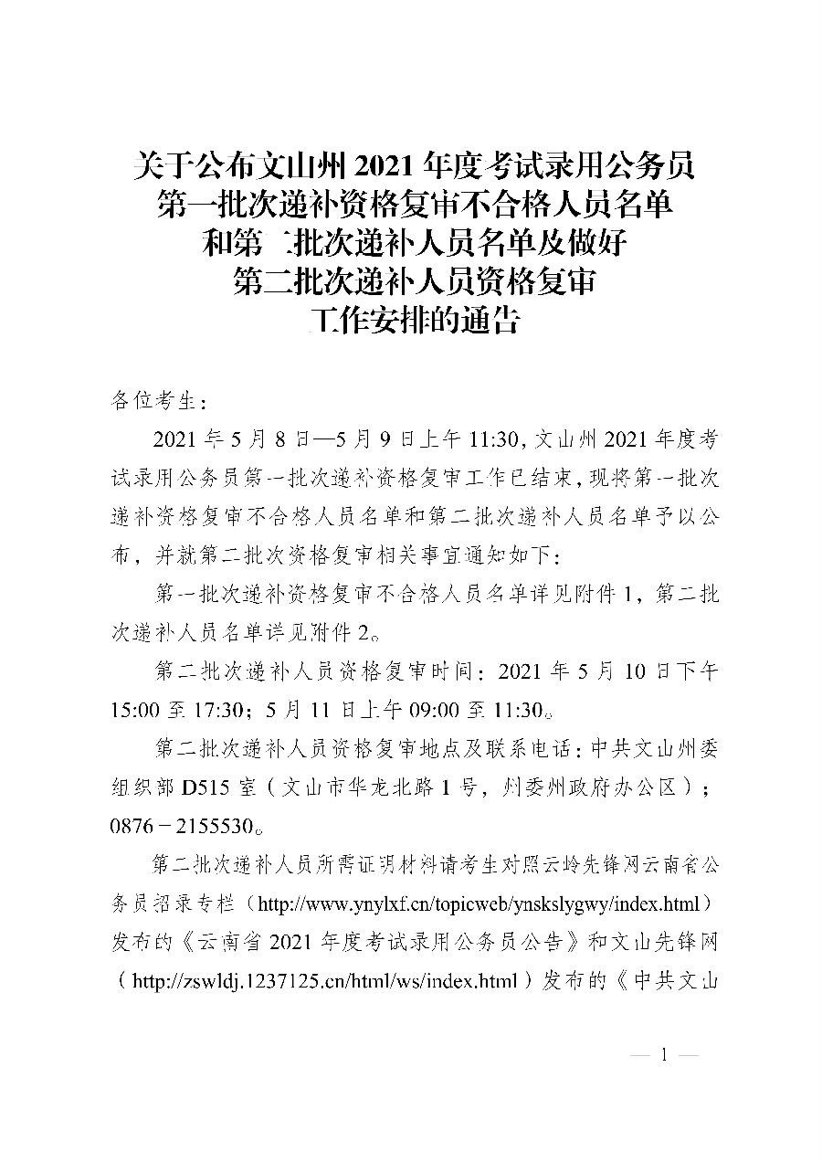 關(guān)于公布文山州2021年度考試錄用公務(wù)員第一批次遞補資格復(fù)審不合格人員名單和