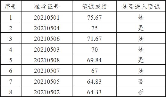 按照選調(diào)崗位筆試成績從高到低的順序,按1:3的比例確定面試人員。筆試成績及進入面試人員名單如下: