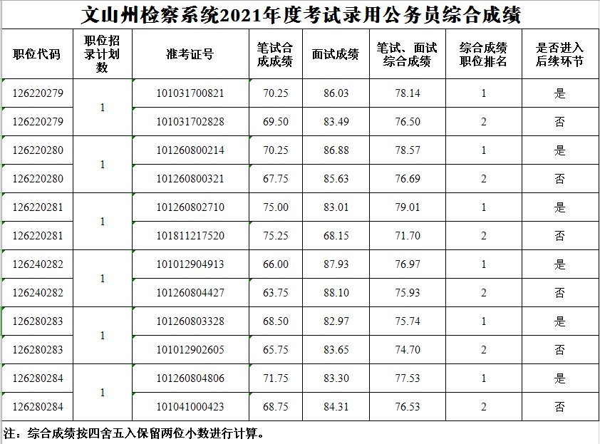 文山州檢察系統(tǒng)2021年度考試錄用公務員綜合成績公告 根據(jù)《云南省2021年度考試錄用公務員公告》安排,現(xiàn)將考生綜合成績公告如下,請進入體檢環(huán)節(jié)的考生按照電話通知要求參加體檢。