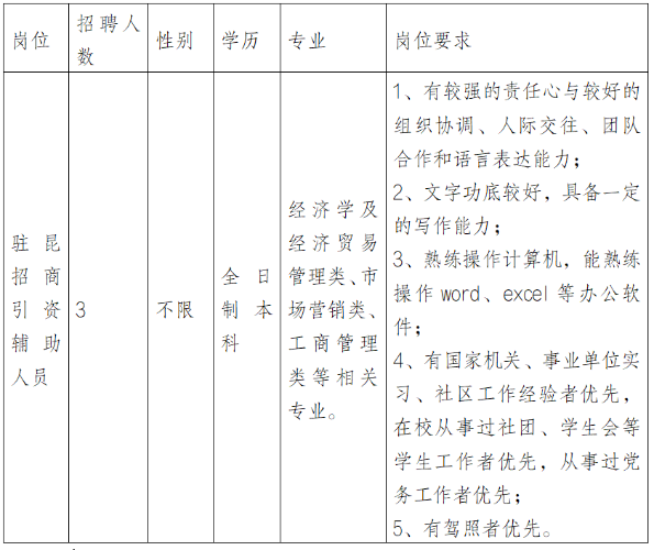 本次招聘合同制招商輔助人員共3人,具體招聘崗位及要求為: