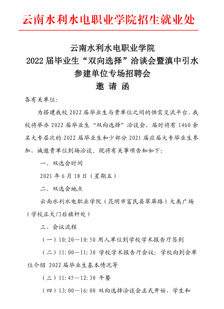云南水利水電職業(yè)學院2022屆畢業(yè)生“雙向選擇”洽談會 暨滇中引水參建單位專場招聘會邀請函