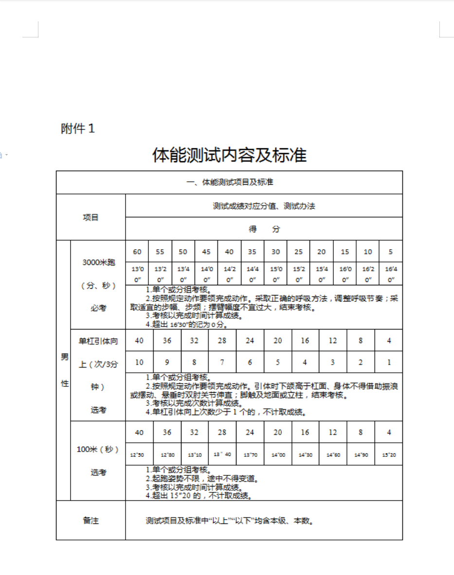(2)體能測(cè)試科目為3000米、單桿引體向上、100米,3000米跑為必考項(xiàng)目(最高60分),單桿引體向上及100米選考一項(xiàng)(最高40分),總成績(jī)最高100分。考核達(dá)標(biāo)標(biāo)準(zhǔn)見(jiàn)附件1。