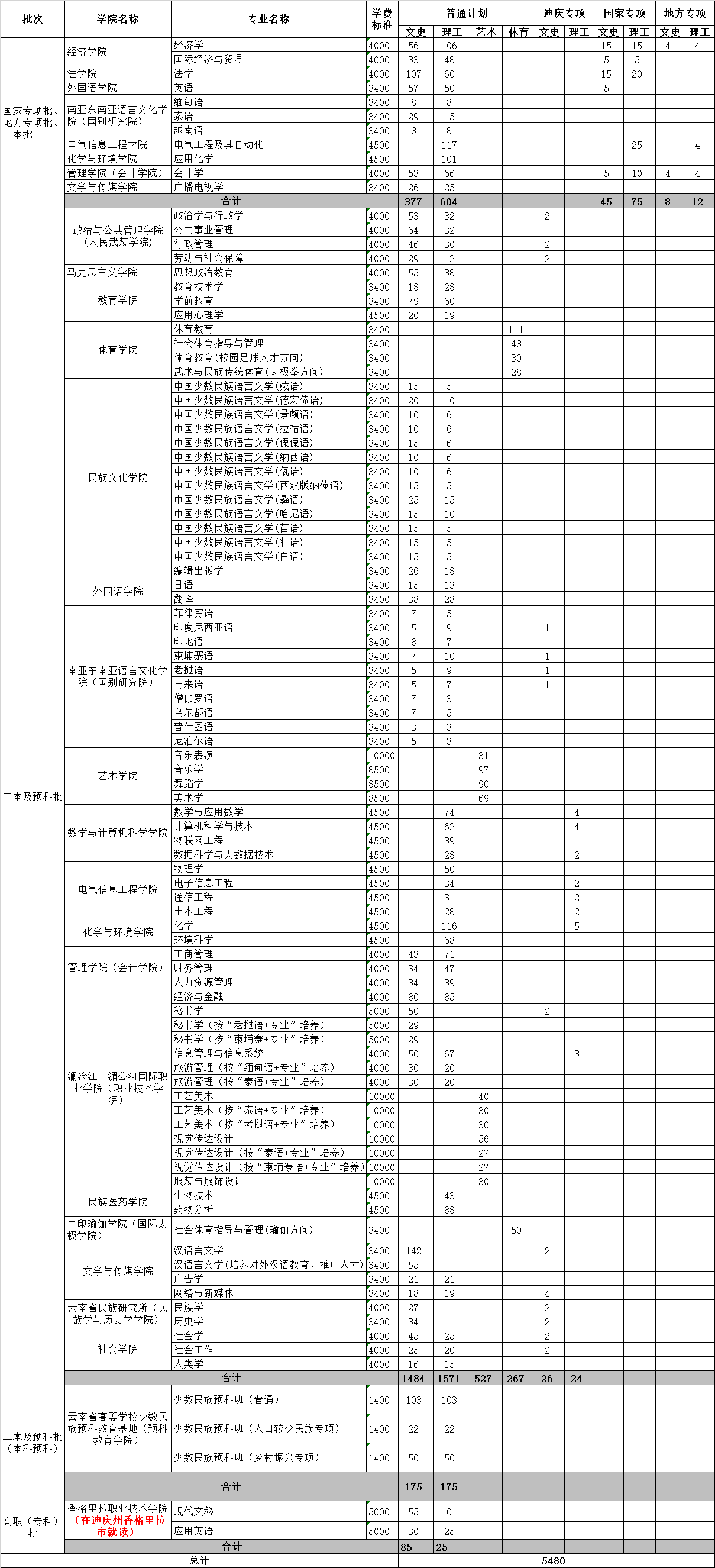 2021年云南省本專科及預(yù)科招生計(jì)劃