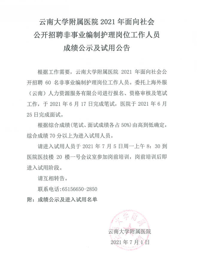 招聘非事業(yè)編制護(hù)理崗位工作人員成績公示及試用公告
