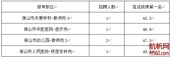 現(xiàn)將2021年保山市市直事業(yè)單位公開遴選管理人員和專業(yè)技術(shù)人員筆試成績、排名及合格分?jǐn)?shù)線公告如下,參加公開遴選的報考人員可以登錄保山市人民政府門戶網(wǎng)站保山市人力資源和社會保障局網(wǎng)頁(http://www.baoshan.gov.cn/zfxxgkpt/rsbm_gkzd_lby.jsp?urltype=tree.TreeTempUrl&wbtreeid=5718)查詢個人成績及排名。