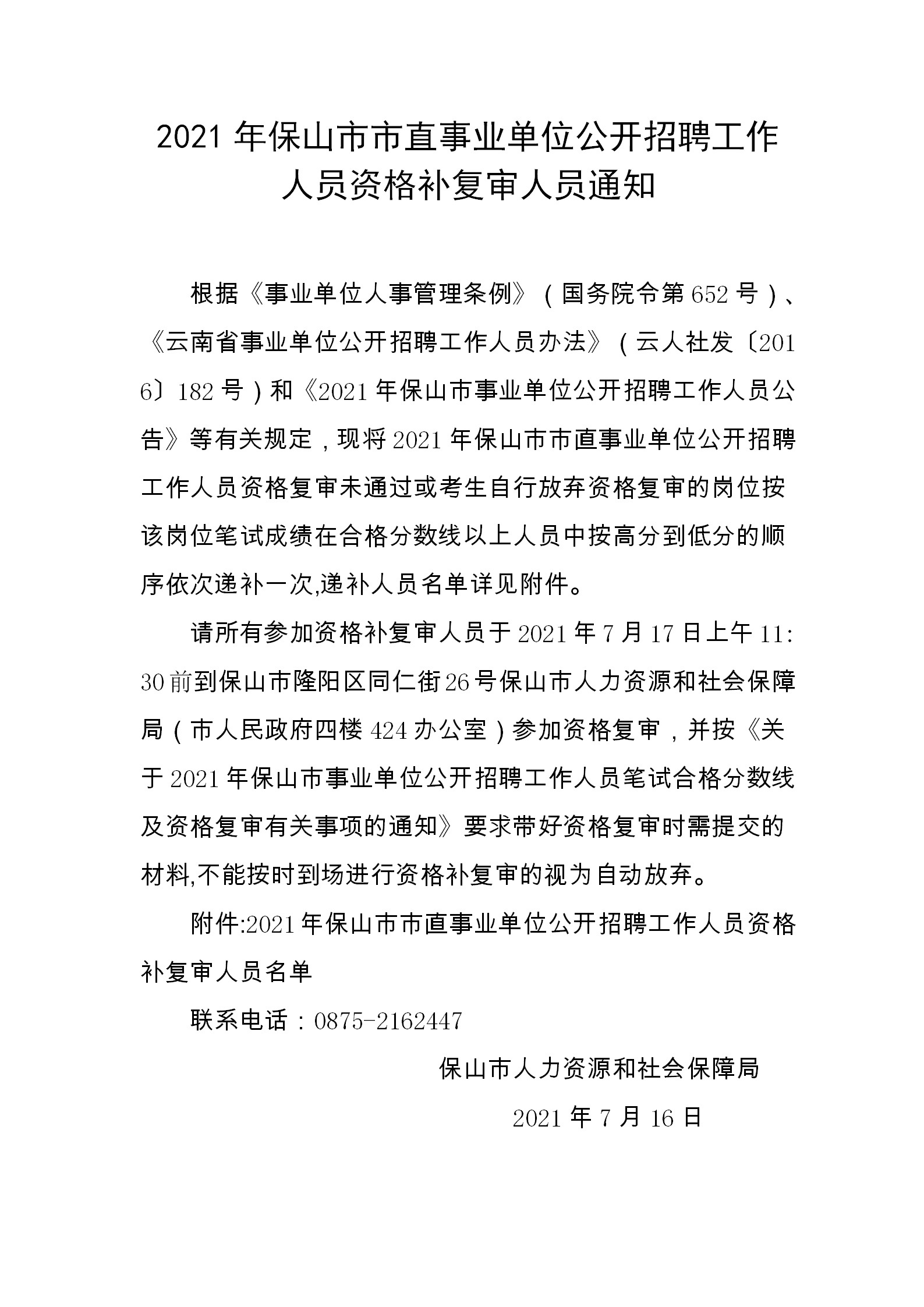 2021年保山市市直事業(yè)單位公開招聘工作人員資格補復審人員通知