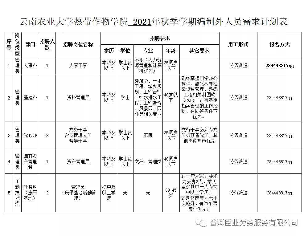 工作人員18名,均為云南農(nóng)業(yè)大學熱帶作物學院非事業(yè)編制人員(即編制外合同制人員),具體崗位信息詳見附件。