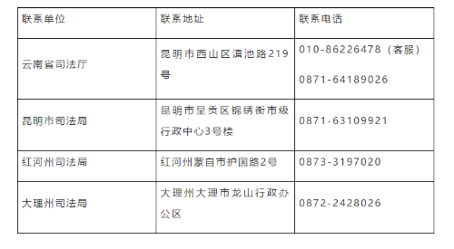 (五)涉及考試報名具體政策事宜,可向設立的考試客服和云南省司法廳電話咨詢;涉及考區(qū)考試具體事宜可向考區(qū)司法局電話咨詢。