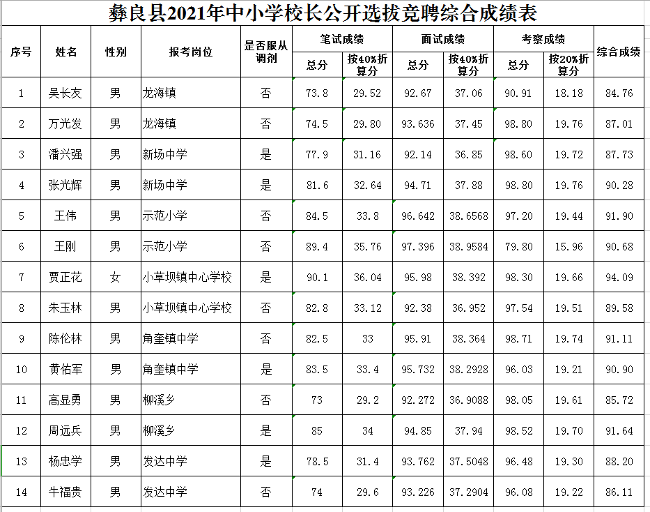 根據(jù)《彝良縣2021年中小學(xué)校長公開選拔競聘上崗筆試成績公告(第一號)》,在公安、保密、紀(jì)委、人社等部門的監(jiān)督指導(dǎo)下,圓滿完成了筆試和面試工作,通過民主推薦、測評、談話、量化評比等完成了對擬考察對象的考察工作,筆試和面試成績分別按40%、考核成績按20%折算,現(xiàn)將公開競聘的14名同志綜合成績公告如下: