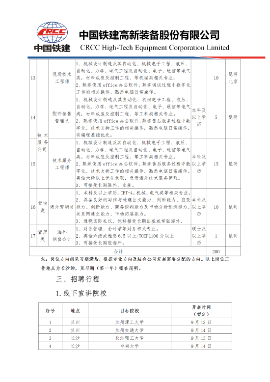 中國(guó)鐵建高新裝備股份有限公司招聘200人
