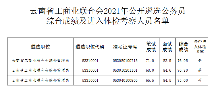 云南省工商業(yè)聯(lián)合會2021年公開遴選公務員綜合成績及進入體檢考察人員名單公告