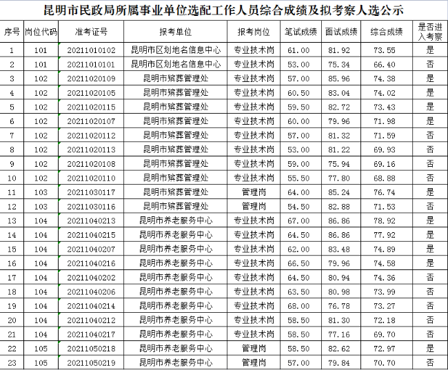 昆明市民政局所屬事業(yè)單位選配工作人員綜合成績及擬考察人選公示