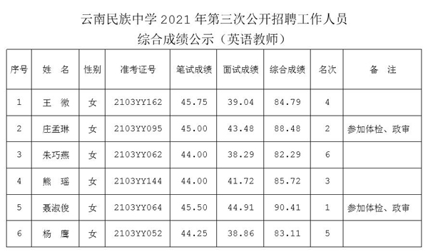 2021年云南民族中學(xué)第三次招聘工作人員綜合成績公示(英語)