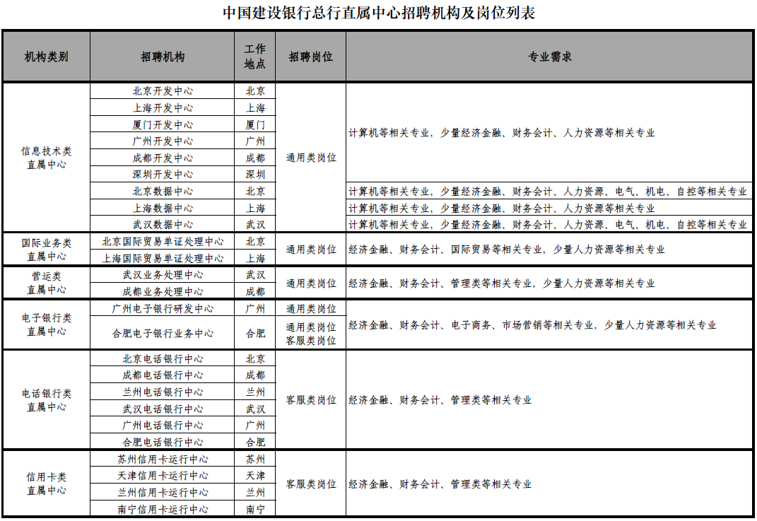 為滿足全行綜合化經(jīng)營對高素質(zhì)人員的需求,中國建設(shè)銀行總行直屬中心、境內(nèi)分支機(jī)構(gòu)現(xiàn)面向境內(nèi)外高等院校畢業(yè)生招聘新員工。現(xiàn)將有關(guān)事項(xiàng)公告如下: