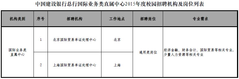 (具體招聘機(jī)構(gòu)、崗位及專(zhuān)業(yè)需求詳見(jiàn)附件:中國(guó)建設(shè)銀行總行國(guó)際業(yè)務(wù)類(lèi)直屬中心2015年度校園招聘機(jī)構(gòu)及崗位列表)
