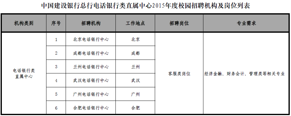 (具體招聘機構(gòu)、崗位及專業(yè)需求詳見附件:中國建設(shè)銀行總行電話銀行類直屬中心2015年度校園招聘機構(gòu)及崗位列表)