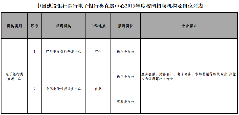 (具體招聘機(jī)構(gòu)、崗位及專(zhuān)業(yè)需求詳見(jiàn)附件:中國(guó)建設(shè)銀行總行電子銀行類(lèi)直屬中心2015年度校園招聘機(jī)構(gòu)及崗位列表)