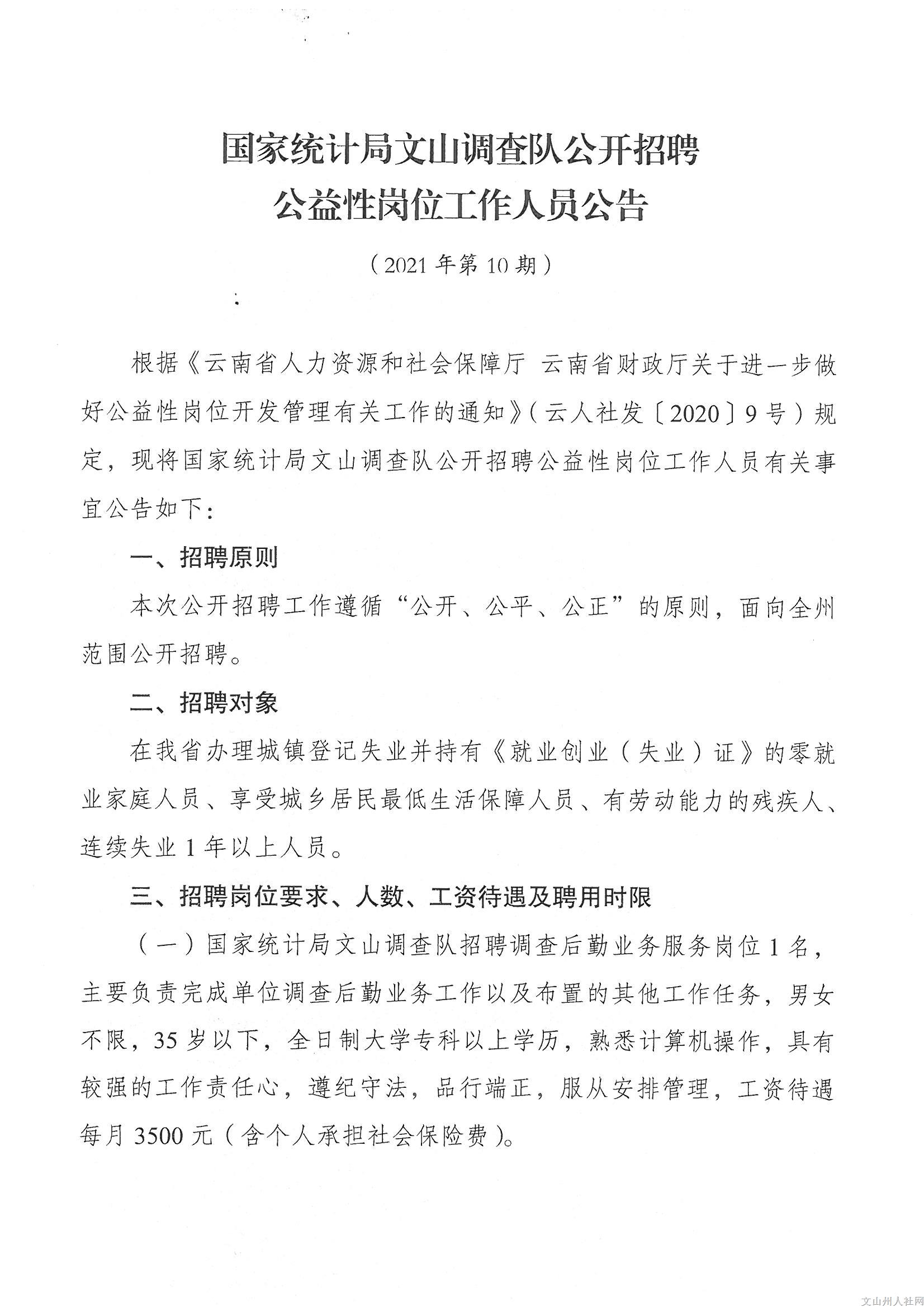 國家統(tǒng)計(jì)局文山調(diào)查隊(duì)公開招聘公益性崗位工作人員的通告(2021第10期)