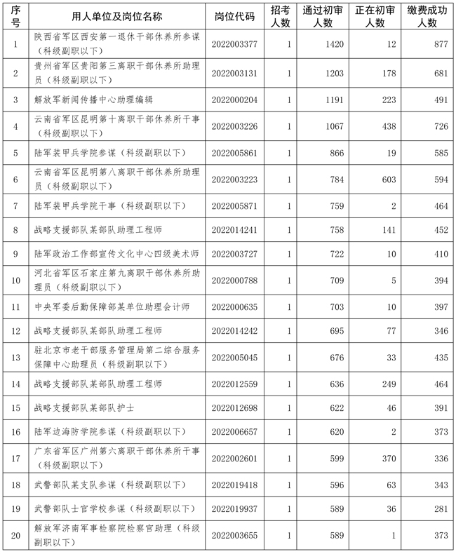 2022年全軍面向社會(huì)公開招考文職人員(不含先面試后筆試崗位)報(bào)名時(shí)段已經(jīng)結(jié)束。截至12月9日18時(shí),提交報(bào)名資格條件初審共933978人次,通過初審的報(bào)考人員387930人,繳費(fèi)成功的報(bào)考人員254508名,用人單位正在進(jìn)行初審的報(bào)考人員82709人。有人報(bào)考的崗位19284個(gè)、占75.5%,平均報(bào)招考比為20.1:1,最高報(bào)招考比為1420:1。12月9日18:00至11日18:00期間,用人單位繼續(xù)進(jìn)行報(bào)名資格條件初審,因證明材料不全未通過初審的報(bào)考人員可補(bǔ)充材料繼續(xù)報(bào)考該崗位。因各城市考試席位有限,通過初審的報(bào)考人員請(qǐng)及時(shí)繳費(fèi)和選擇考試城市。