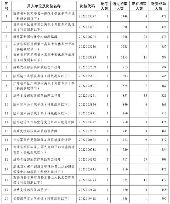 2022年全軍面向社會公開招考文職人員(不含先面試后筆試崗位)網(wǎng)上報名資格條件初審正在進(jìn)行中。截至12月10日17時,提交報名資格條件初審共975324人次,通過初審的報考人員447958人,繳費(fèi)成功的報考人員320623名,用人單位正在進(jìn)行初審的報考人員17063人。有人報考的崗位19731個、占77.3%,平均報招考比為22.7:1,最高報招考比為1446:1。12月11日18:00前,用人單位繼續(xù)進(jìn)行報名資格條件初審,因證明材料不全未通過初審的報考人員可補(bǔ)充材料繼續(xù)報考該崗位。因各城市考試席位有限,通過初審的報考人員請及時繳費(fèi)和選擇考試城市。