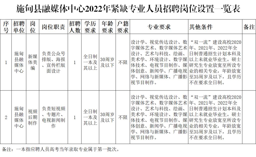 為切實(shí)加強(qiáng)宣傳隊(duì)伍建設(shè),更好的發(fā)揮融媒體中心引導(dǎo)群眾、服務(wù)群眾的功能,根據(jù)《關(guān)于進(jìn)一步規(guī)范我市事業(yè)單位到校園公開招聘工作人員有關(guān)事項(xiàng)的通知》(保人社聯(lián)〔2020〕18號(hào))精神,結(jié)合新聞宣傳工作實(shí)際,經(jīng)報(bào)請(qǐng)縣委、縣人民政府同意,現(xiàn)將施甸縣融媒體中心2022年新聞緊缺專業(yè)人員招聘工作有關(guān)事項(xiàng)公告如下。