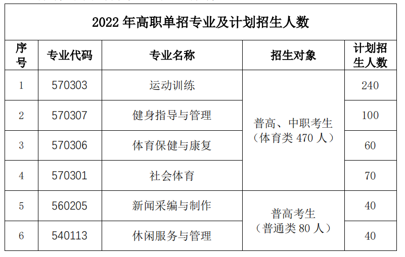 2022年我校高職單招計(jì)劃招生550人,各專業(yè)具體招生名額以上級(jí)實(shí)際下達(dá)計(jì)劃數(shù)量為準(zhǔn);計(jì)劃6個(gè)專業(yè)面向高職單招考生招生,其中普通類(lèi)專業(yè)2個(gè):新聞采編與制作、休閑服務(wù)與管理;體育類(lèi)專業(yè)4個(gè):運(yùn)動(dòng)訓(xùn)練、健身指導(dǎo)與管理、體育保健與康復(fù)、社會(huì)體育。