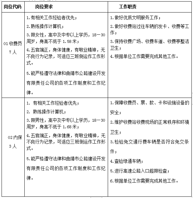本次面向社會公開招聘,招聘人數(shù)10人:收費員7人,內(nèi)保3人。