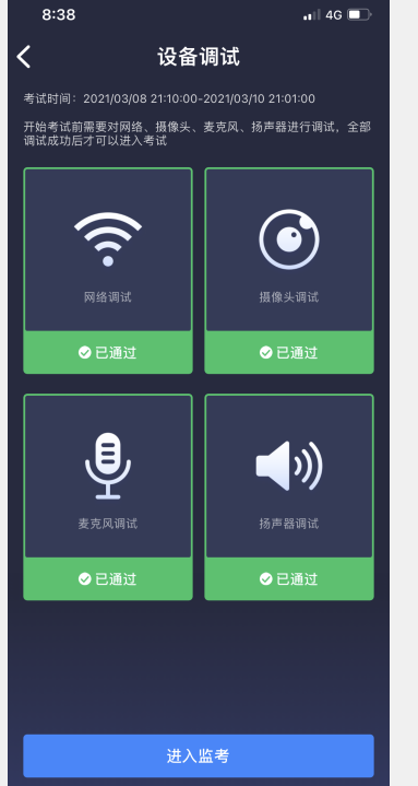 如人臉匹配成功,則可進(jìn)入考試。如人臉匹配不成功,會(huì)提示人臉匹配失敗,三次匹配不成功則自動(dòng)保存異常記錄,監(jiān)考教師會(huì)根據(jù)考生實(shí)際情況判定該生是否可以參加考試,此過(guò)程中考生須全程配合相關(guān)操作,否則不可參加考試。