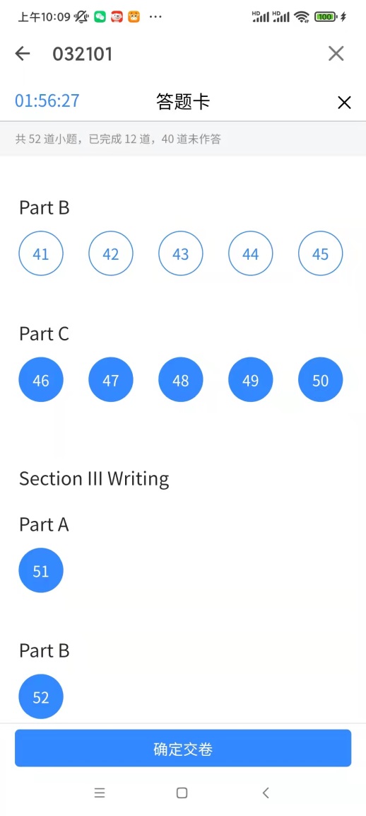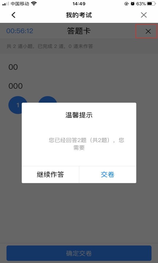 學(xué)生答題完畢后,在規(guī)定的時(shí)間即可點(diǎn)擊“確定交卷”,若沒(méi)有點(diǎn)擊交卷按鈕,考試時(shí)間截止后系統(tǒng)也會(huì)自動(dòng)交卷。