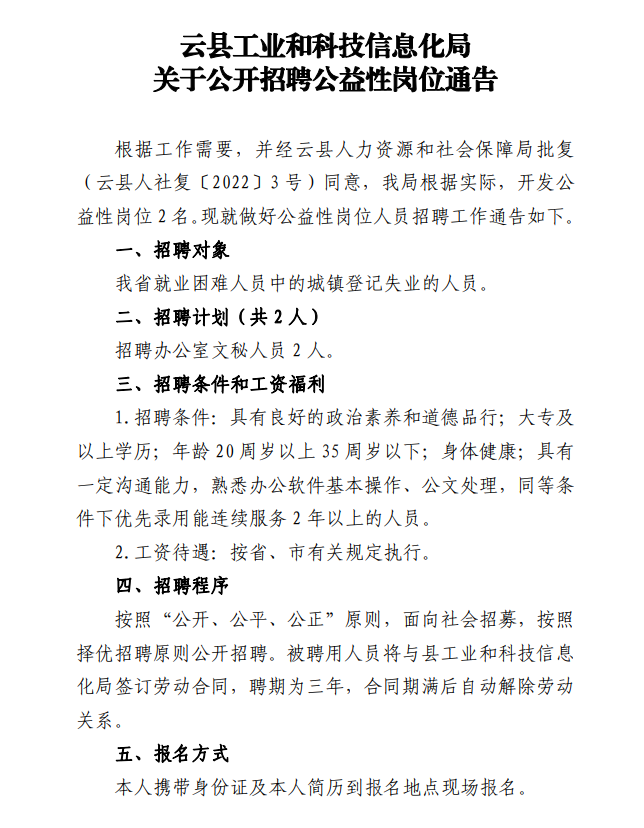 云縣工業(yè)和科技信息化局關(guān)于公開招聘公益性崗位通告