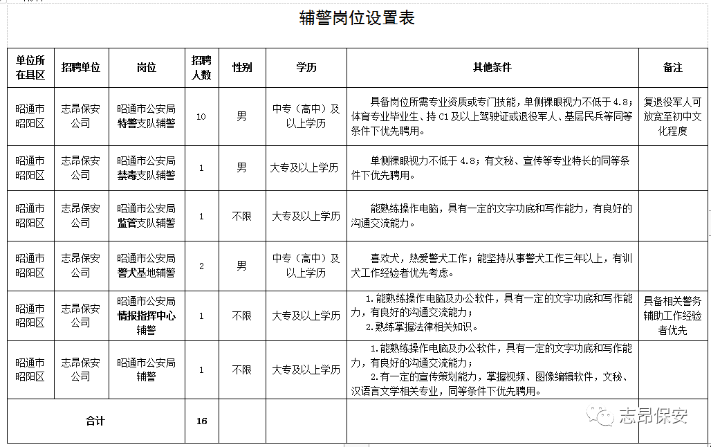 昭通志昂保安服務(wù)有限責(zé)任公司面向社會招聘工作人員,派遣至昭通市公安局從事警務(wù)輔助工作。現(xiàn)將有關(guān)事項公告如下: